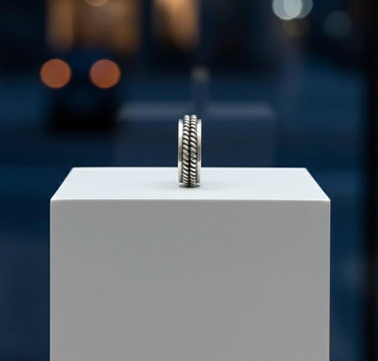 Crafted for the modern man, this striking ring seamlessly blends textured detailing with functional design. Made from high-quality sterling silver, the ring features a central band, bordered on both sides