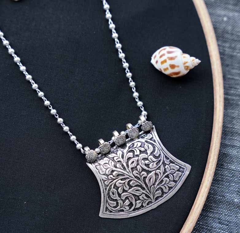 A bold shield-shaped pendant featuring intricate hand-engraved floral patterns, crowned with tiny lotus-like motifs at the top for a touch of traditional elegance.