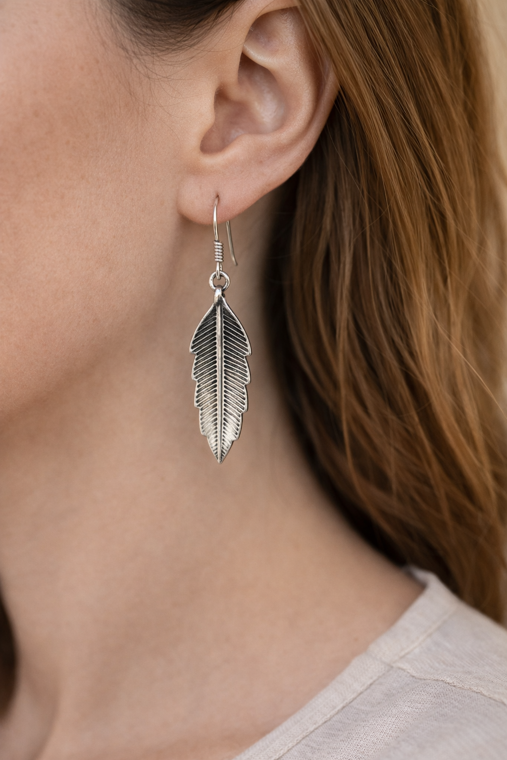 Graceful silver earrings designed in a detailed feather silhouette with fine engraved texture.