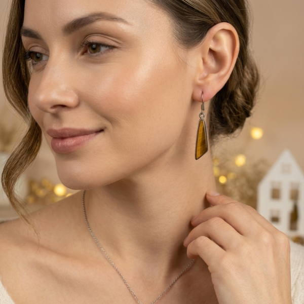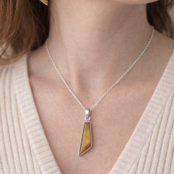 Elevate your style with this elegant tiger eye gemstone set featuring a sleek geometric pendant and matching drop earrings. Designed for a modern yet timeless look, perfect for both everyday wear and special occasions.