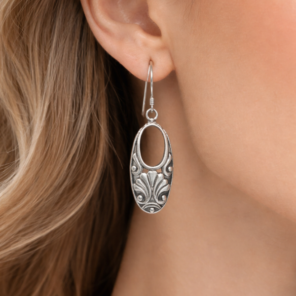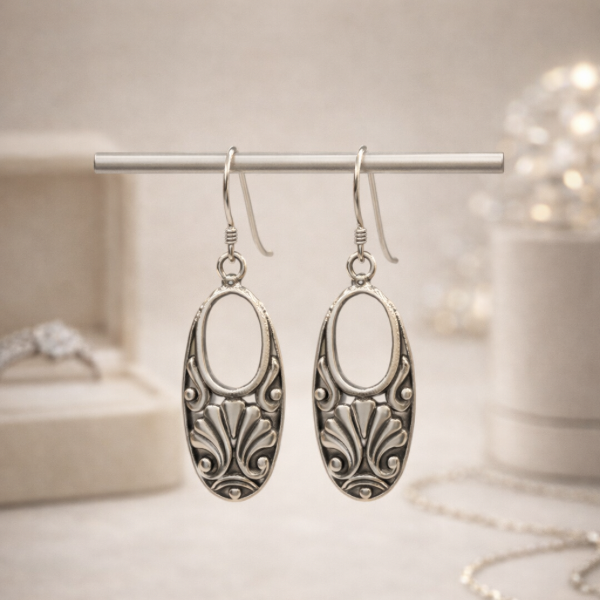 Beautifully crafted sterling silver earrings with ornate floral detailing and a classic elongated oval shape.