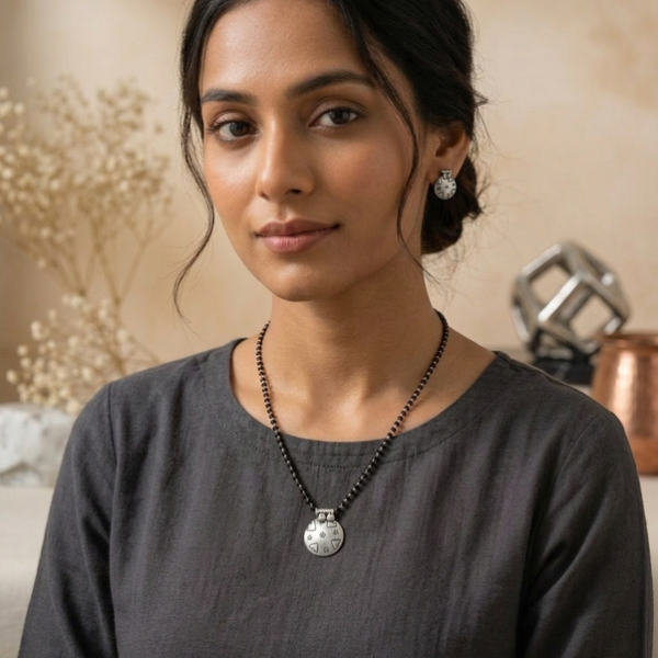 A modern take on tradition, this sleek mangalsutra features a delicate black bead chain with a minimalist silver charm pendant. Perfect for everyday elegance with a subtle cultural touch.