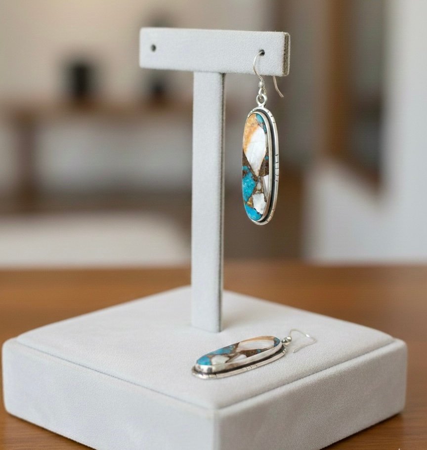 Elegant elongated oval drop earrings with a stunning inlay of multiple gemstones, including turquoise blue, earthy orange, white, and brown tones, creating a mosaic-like artistic pattern.