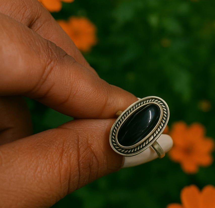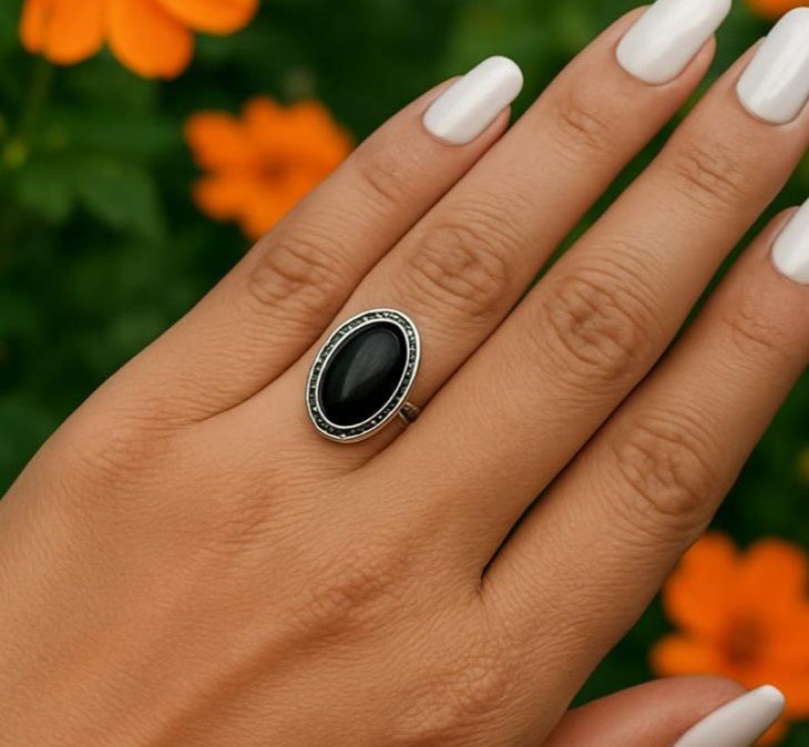 This elegant oval-shaped ring is crafted in 925 sterling silver, featuring a polished black onyx gemstone at its center.