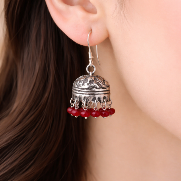 Oxidised Silver Engraved Jhumka Earrings with Red Bead Drops