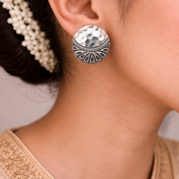 Featuring a striking hammered dome design with intricate ethnic detailing, these oxidised silver studs offer a bold yet elegant appeal.