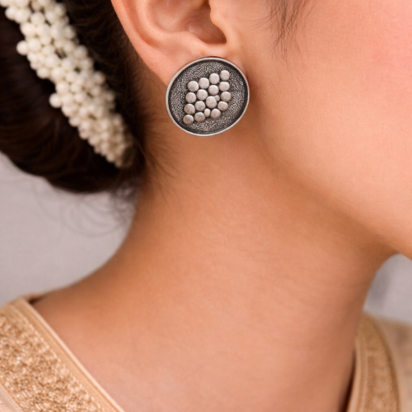 Featuring a unique cluster of raised dot detailing, these oxidised silver studs offer a bold yet minimal ethnic appeal.