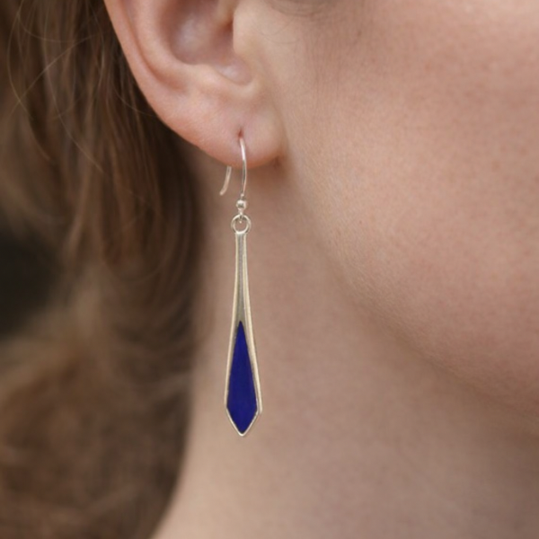 Elegant sterling silver drop earrings featuring a deep sapphire-blue enamel center in a sleek elongated design.