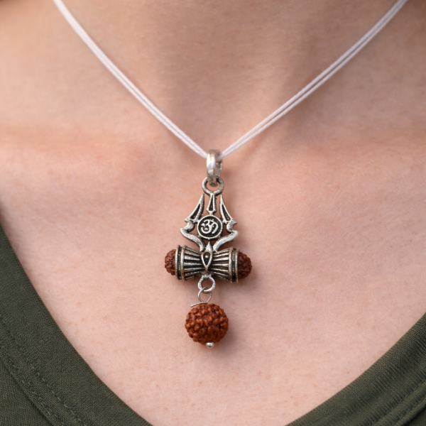 A beautifully crafted sterling silver pendant featuring the sacred Trishul and Om symbol paired with natural Rudraksha beads.