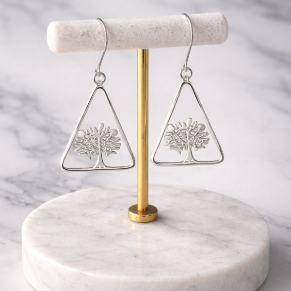 Capturing the harmony between nature and geometry, these handcrafted 925 sterling silver earrings feature a detailed Tree of Life encased within a sleek, minimalist triangle. A sophisticated accessory designed to add a touch of organic elegance to your everyday ensemble.